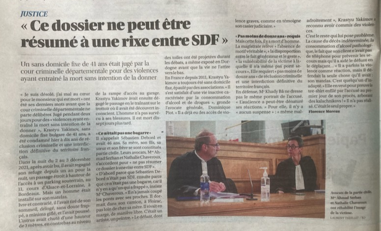 Article du Sud Ouest du 27 mars 2024 "ce dossier ne peut être résumé à une rixe entre SDF"